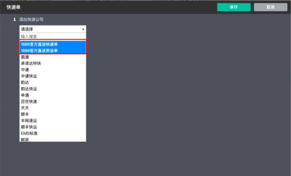 点击添加模版,根据需要选择“1688直送快递单”或者“1688直送货运单”模版